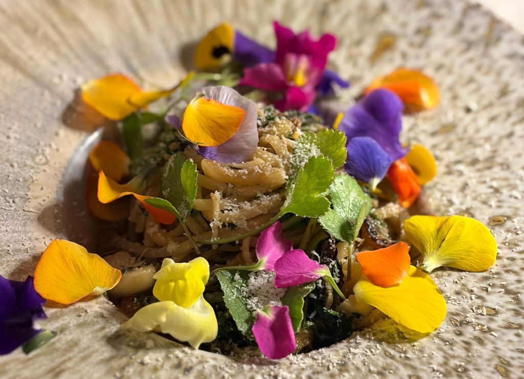 꽃바구니 : 화려한 진주 교방 음식의 꽃국수에서 영감을 받았으며 사찰 음식의 식물의 뿌리부터 줄기, 이파리, 꽃잎까지 모두 식탁 위에 올리는 '전체식'의 철학을 함께 접시 위에 담아내었습니다. 야생의 묵직한 육향을 품은 맑은 꿩 육수와 봄나물들을 함께 조리하고 3월 산과 들의 꽃잎들을 곁들였습니다.